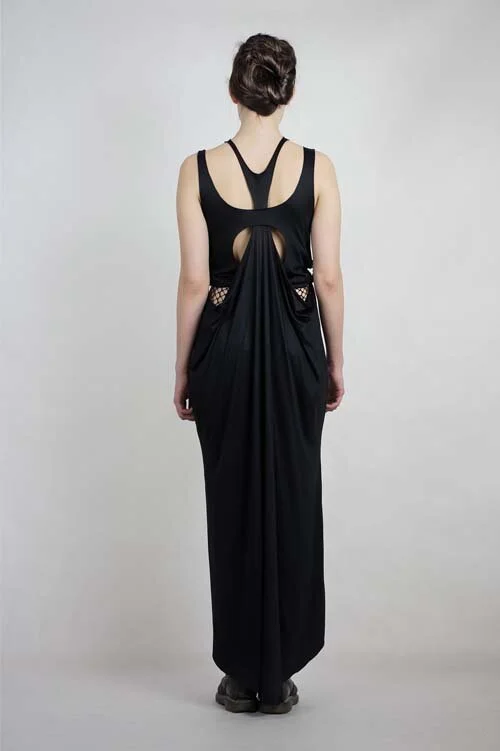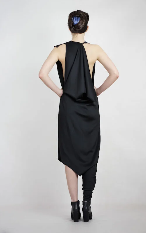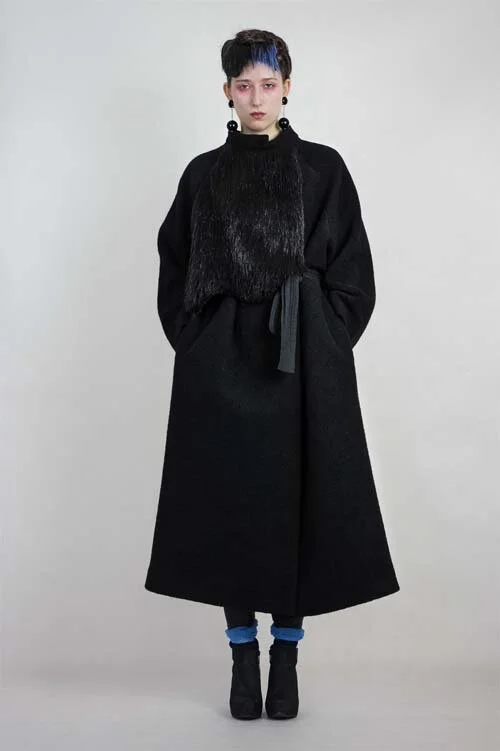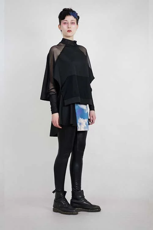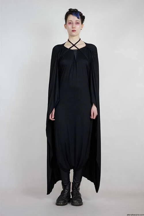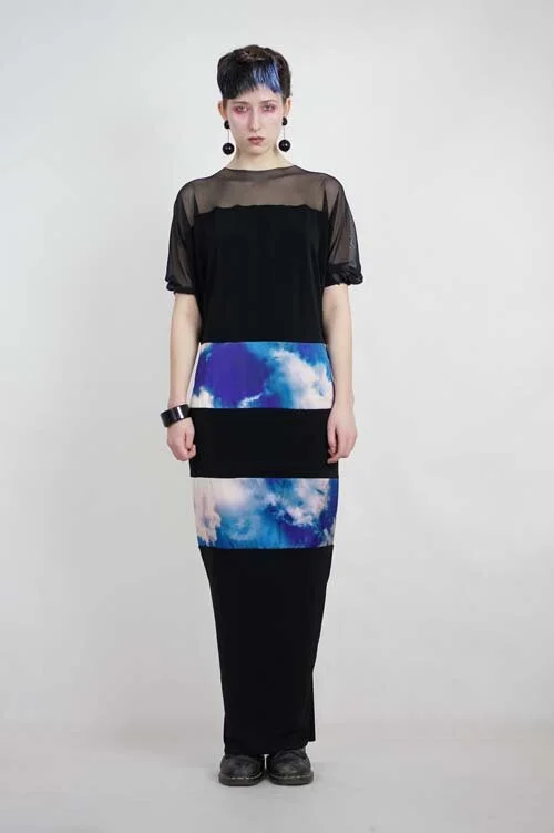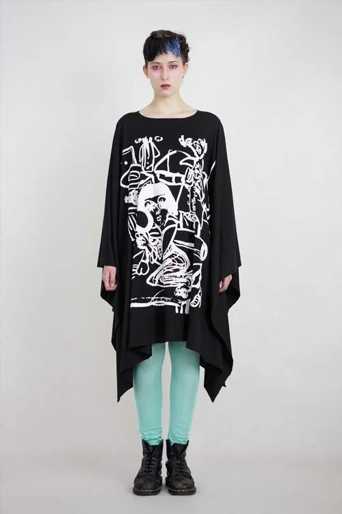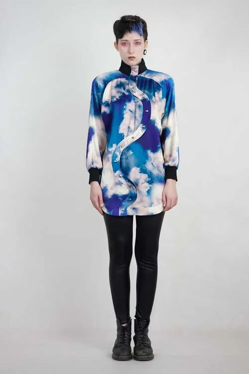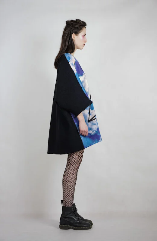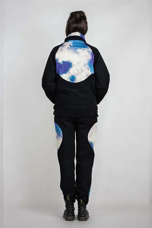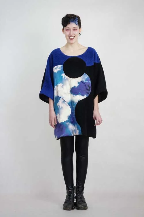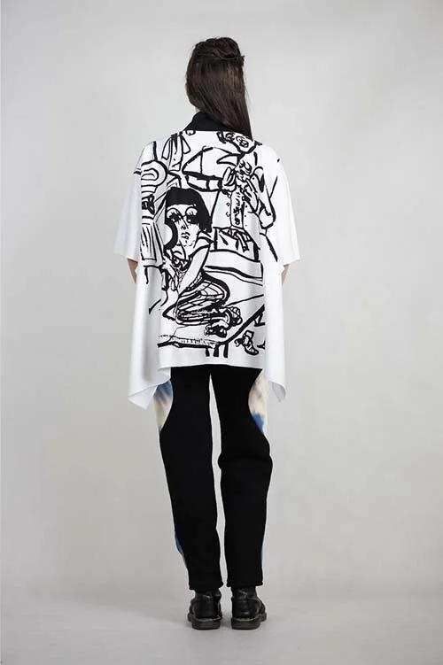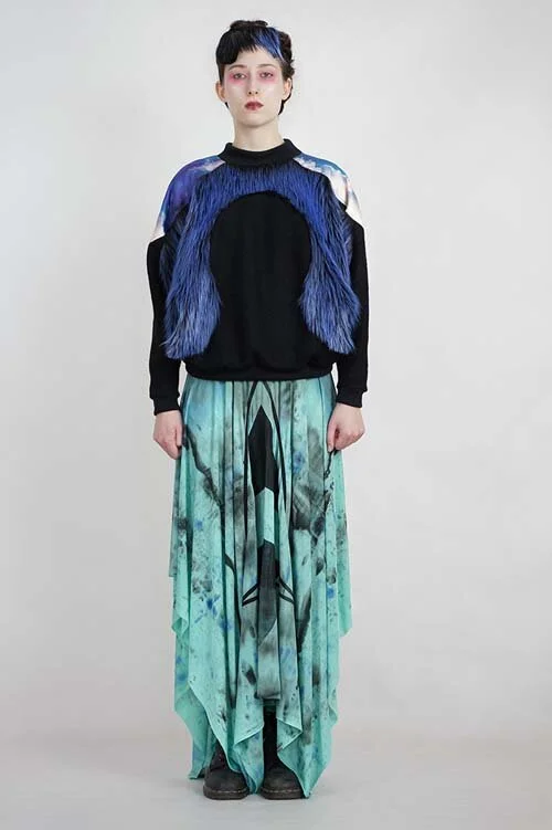 Mojo is your energy and enchantment; your magic and magnetism; your power and 'pizzazz'. It´s the talisman you choose to protect and lift your being. A mix of magical ingredients: here’s where I tie-dyed, hand-painted on silk, quilted, and created a silkscreen print that represented a 'Mojo scene'. Unique textiles emerged from this. A ludic clouds print provided the 'above human element'. Faux fur in acid blue and black represent the attachment to the earth, the superstitious side that we have inherited from our ancestors. Psychedelic hand-dyed silk elements, like the pumping blood of a beating heart embodied by somebody with MOJO!